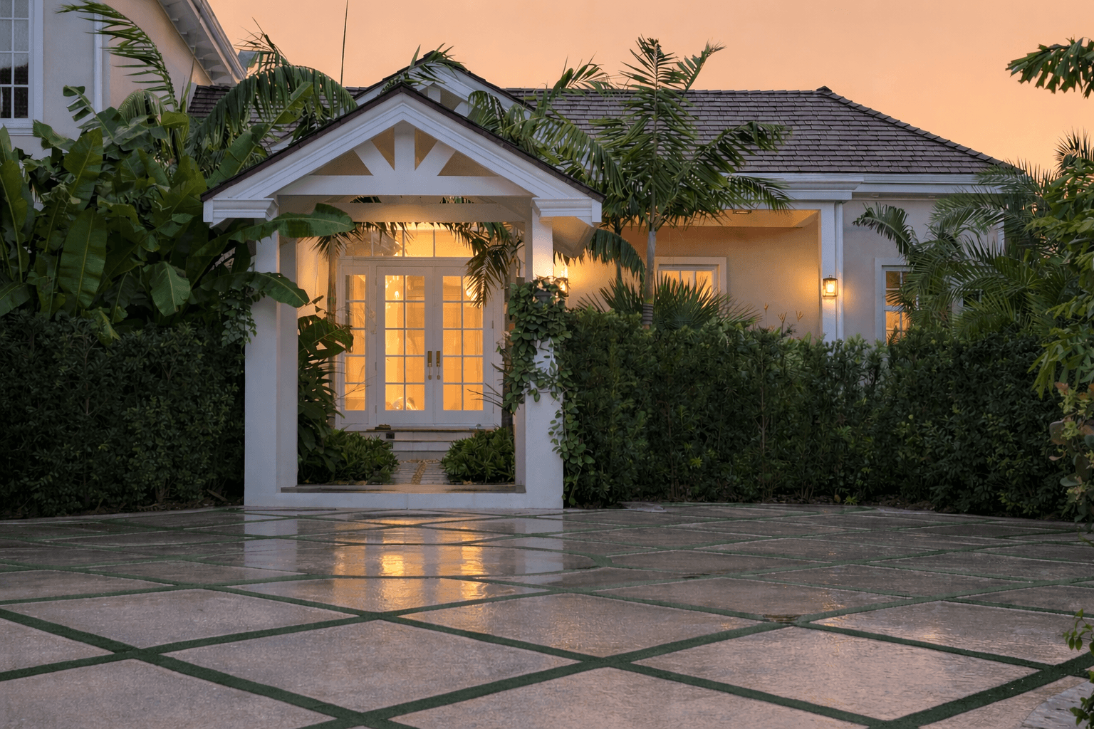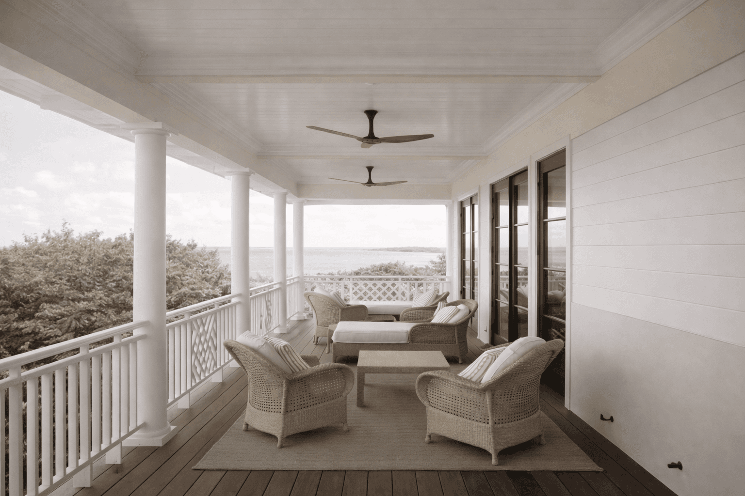 Architecturally, the project draws from a familiar Bahamian language—pitched roofs, deep overhangs, lattice railings, and elevated stone plinths—but pares each element back to its essential form. The buildings sit lightly, their weight grounded in native stone while their upper volumes dissolve into shade and air.